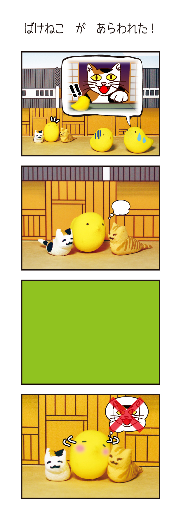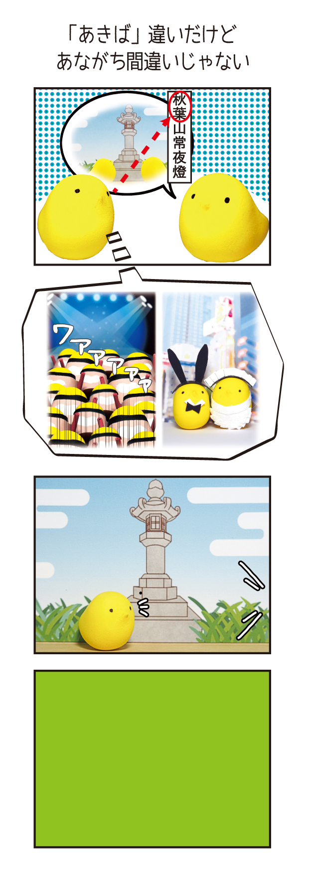 みなさんのお住まいの地域にも、もしかしたら常夜燈があるかもしれませんね。常夜燈は大きさや形もそれぞれ異なるようなので、いろいろな常夜燈を背景にして4コマ目を作ってみたい、というのがひそかな目標でもあります。