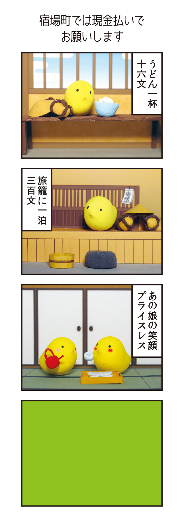 最後に、この話の元ネタですが、言わずもがな某クレジットカードのCMです。なので4コマ目の背景は、CMに近づけるなら真っ黒、王道なら旅籠っぽい町家(余談ですが、愛知県豊橋市にある二川宿本陣資料館には1度行ってみたいと常々思っています)、ウケ狙いで古銭の画像・現在の札束なんかも面白そうです。