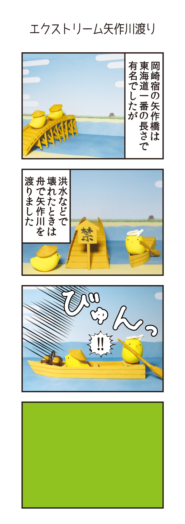 4コマまんがでも、橋が壊れて通れないとりさんが舟で矢作川を渡ります。しかしそこに、とんでもない渡り方をする猛者が現れます。