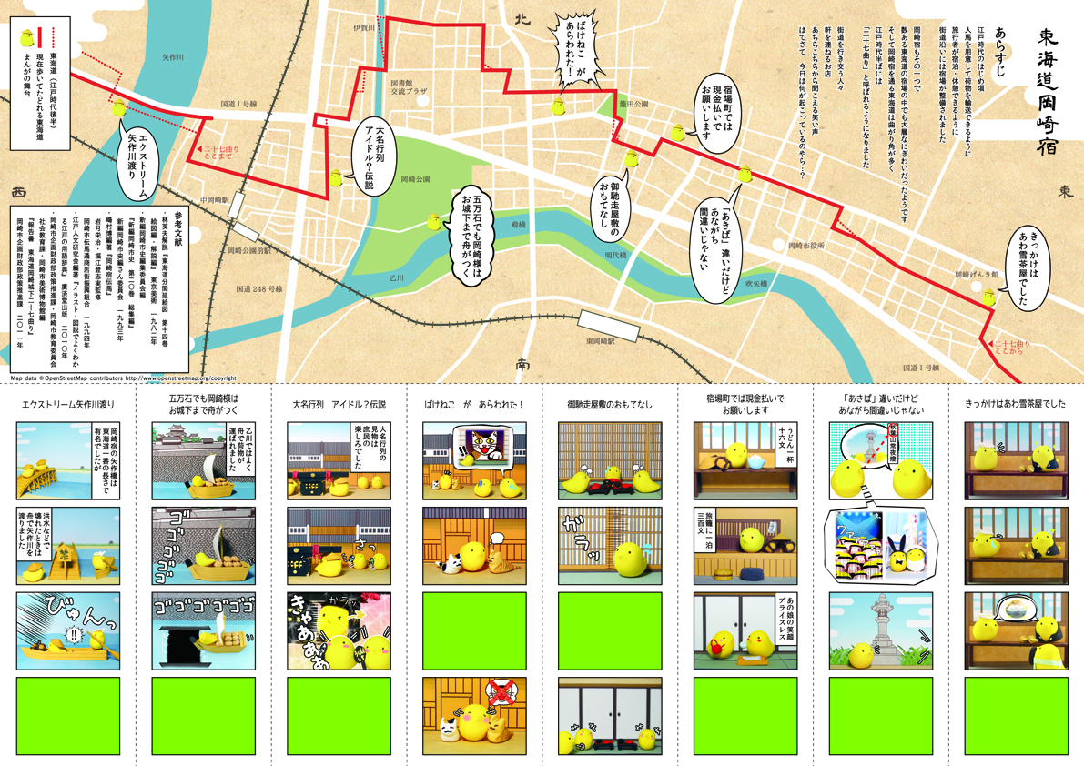 4コマまんがとAR(拡張現実)を手に携えて、まちあるきを楽しみながら自分だけの岡崎宿の物語を作ることができます。気づいたら前よりもちょっと歴史に詳しくなっていること間違いなし。テストには出ないけどためになる?"なんちゃって"歴史まんがです。